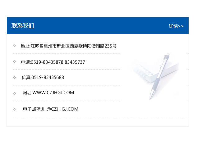傳真:0519-83435688    郵編:213135    網址:WWW.czjhgj_com.akkaitian.com    電子郵箱:JH@czjhgj_com.akkaitian.com